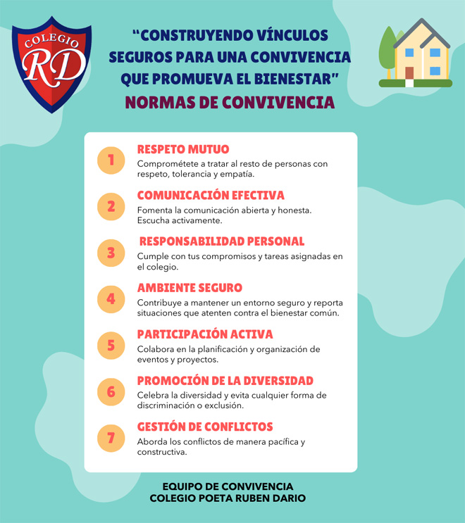 Nuestro Colegio “Poeta Rubén Darío” tiene la responsabilidad de educar en los principios, valores, competencias y habilidades necesarias para la sana convivencia, no solo en el entorno escolar, sino también en sociedad para desarrollarse como ciudadanos. Una convivencia escolar positiva permite entre nuestros(as) NNA sentirse parte de su Colegio, sentirse valorado, respetado, acogido y participar de manera activa en su vida escolar.