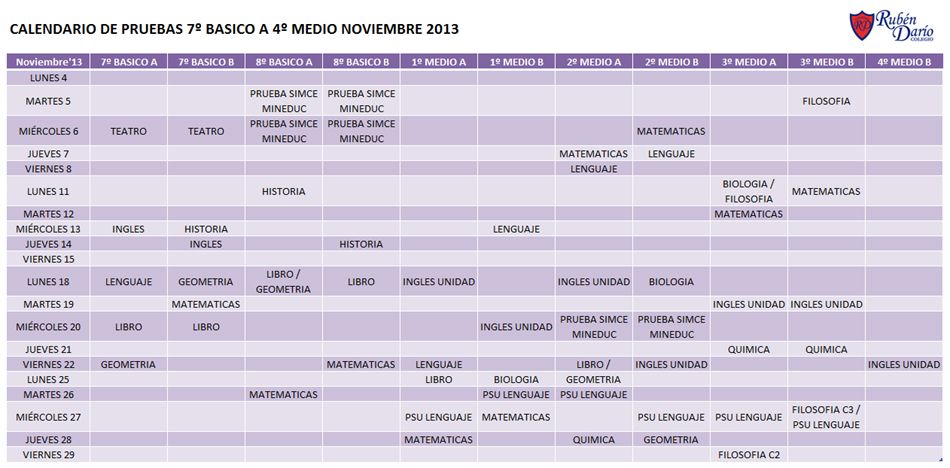 Calendario de Pruebas Noviembre 2013 (7º Bás – 4º Med)